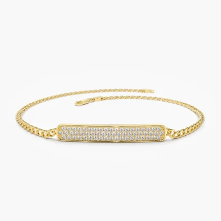The 14K Gold 3MM Curb Link Diamond Pave Bracelet features 58 round diamonds with a total of 0.39 ct. The bar measures 26mm in length and 4mm in width. Available in white, rose, or yellow gold, the bracelet is BIS Hallmarked and ships in 10-12 business days. Customer support is available via live chats and video calls.