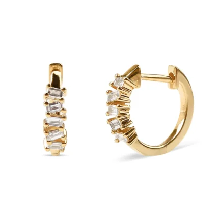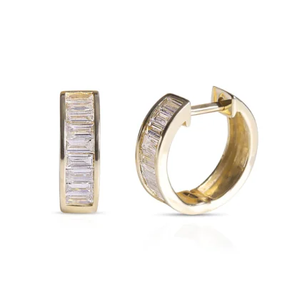 The Andrea Baguette Natural Diamond Huggies are made from 18k solid gold and feature 0.88 ct of diamonds, offering a luxurious and elegant design. With a 5 mm width and 15 mm diameter, these huggies are available in white, rose, or yellow gold. BIS Hallmarked for quality assurance, they are shipped in 10-12 business days, with live chat and video call customer support available.