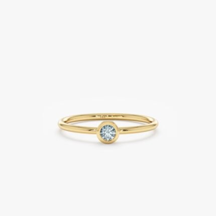 14K solid gold ring with 0.11ct aquamarine and natural diamonds. Bezel set with 1.3 mm band. GIA certified & BIS hallmarked.