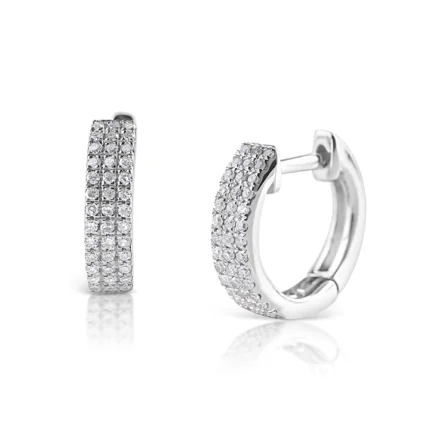 The Gigi Triple Row Natural Diamond Huggies offer luxurious elegance with up to 0.64 ct of diamonds, crafted in 18k solid gold. Available in white, rose, and yellow gold, these huggies come in two sizes, 10 mm and 12 mm, each with multiple diamonds for a radiant sparkle.