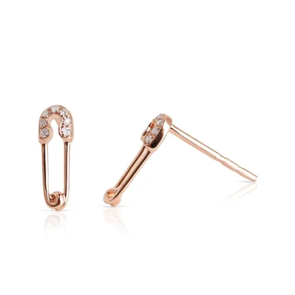 The Natural Diamond Safety Pin Earrings feature a sleek, modern design, crafted from 18k solid gold with diamond accents. These earrings measure 1 inch in length and 1/4 inch in width, offering a chic and edgy look perfect for any occasion. Available in white, rose, or yellow gold.
