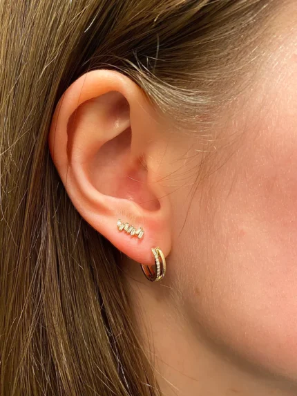 The Tiara Natural Diamond Climber Earrings feature an elegant and modern design, crafted in 18k solid gold. These earrings are adorned with 10 brilliant diamonds (0.09 ct) and 22 pave diamonds (0.07 ct), totaling 0.16 ct for a sophisticated sparkle.