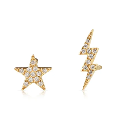 The Black Natural Diamond Star and Lightning Bolt Studs combine striking design with elegance. Crafted from 18k solid gold, these studs are available in white, rose, or yellow gold. Featuring unique star and lightning bolt motifs adorned with black diamonds.