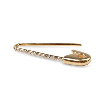The Alexa Diamond Safety Pin Earring is a modern twist on a classic design, crafted from 18k solid gold and featuring elegant diamond accents. Measuring 1 inch in length and 1/4 inch in width, this earring adds a chic, edgy look to any ensemble. Available in white, rose, or yellow gold, and certified BIS Hallmarked for guaranteed quality. Shipping time is 10-12 business days, with customer support available via live chats and video calls for a personalized shopping experience.