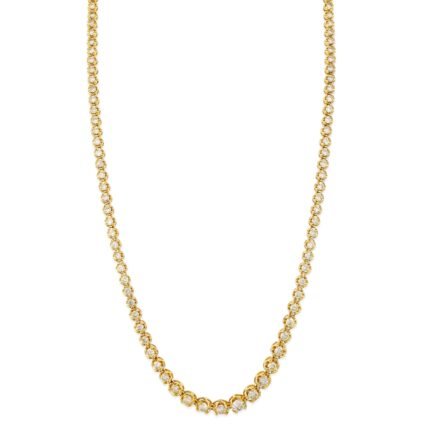 The 14K Gold Graduated Buttercup Diamond Tennis Necklace is a luxurious statement piece featuring 5.50 cts of lab-grown diamonds. This 18-inch necklace showcases a graduated design with buttercup settings, enhancing the brilliance of each diamond, making it perfect for elegant occasions.