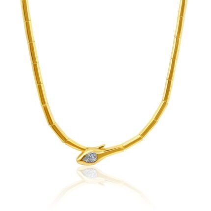 The 18k Gold Bar Snake Diamond Necklace features 0.41 cts of lab-grown diamonds, offering VS1 clarity and F color. The diamonds are elegantly set along a gold bar with a subtle snake-like curve, creating a modern and distinctive look. With its polished finish, this necklace combines unique design with everyday elegance, perfect for any occasion.