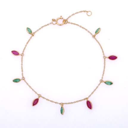 Elegant 14K solid gold bracelet adorned with vibrant emeralds and rubies. A timeless piece that blends rich colors with classic sophistication.