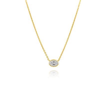 The 14K Gold Diamond Oval Lab Grown Necklace features a 0.73 ct lab-grown oval diamond with VS1 clarity and F color. Suspended from a delicate 14KT gold chain, this elegant necklace offers a sophisticated look, perfect for both everyday wear and special occasions.
