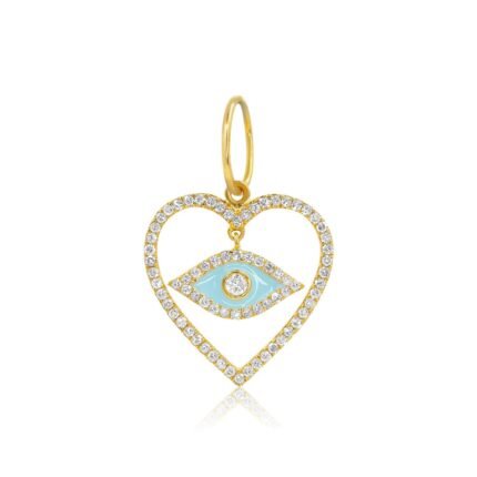 14K Gold Diamond Open Heart Turquoise Enamel Evil Eye Pendant