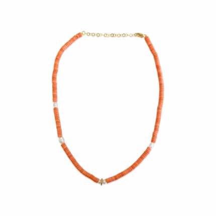 Vibrant 18k solid gold necklace featuring pearls, orange heishi beads, and diamond accents—playful, elegant, and perfect for modern layering.