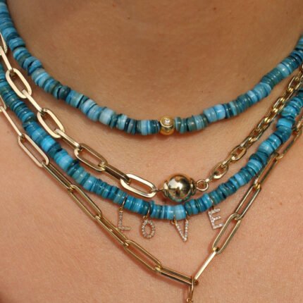 18k Solid Gold Diamond Love Blue Heishi Beaded Necklace