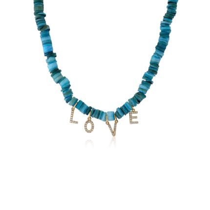 Playful 18k solid gold necklace with blue heishi beads and a diamond-accented "Love" charm—crafted for vibrant elegance and expressive style.