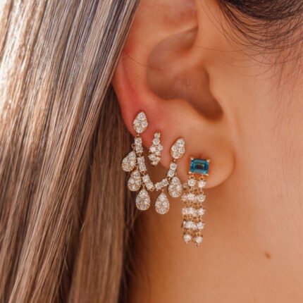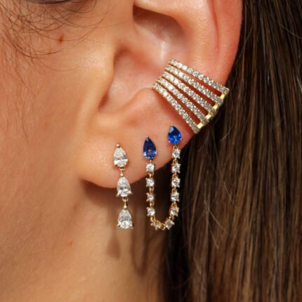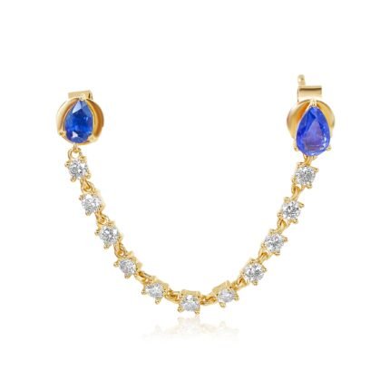 "Elegant 18k Gold Blue Sapphire Pear Moissanite Diamond Connecting Earring – a sophisticated design with blue sapphires and Moissanite diamonds, perfect for a chic, radiant style."