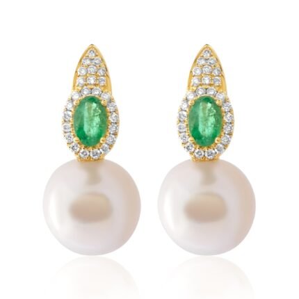 "Elegant 18k Gold Pave Moissanite Diamond Emerald Pearl Hoop Earring – a stunning combination of Moissanite diamonds, emeralds, and pearls for a bold, refined style."
