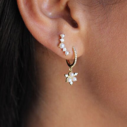 18k Gold Moissanite Diamond Pearl Cluster Drop Hoop Earring
