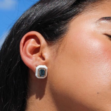 18k Solid Gold Pave Moissanite Diamond White Enamel Blue Topaz Octagon Earring