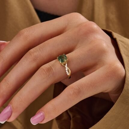 Elegant 18k solid gold cushion moss agate engagement ring, combining natural beauty and timeless design for a unique and meaningful symbol of love.