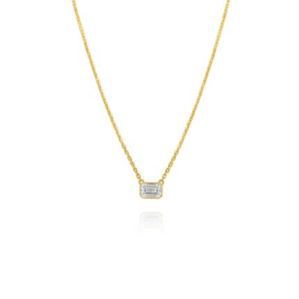 The 14K Gold Diamond Baguette Cut Lab Grown Necklace features a 0.71 ct lab-grown diamond with a sleek baguette cut, VS1 clarity, and F color. Suspended from a delicate 14KT gold chain, this necklace offers a modern and elegant touch, perfect for any occasion.