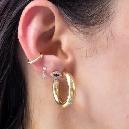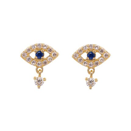 Elegant 14K gold evil eye drop earring with blue sapphire and diamonds. Available in yellow, rose, or white gold. Sold as a single piece or pair.